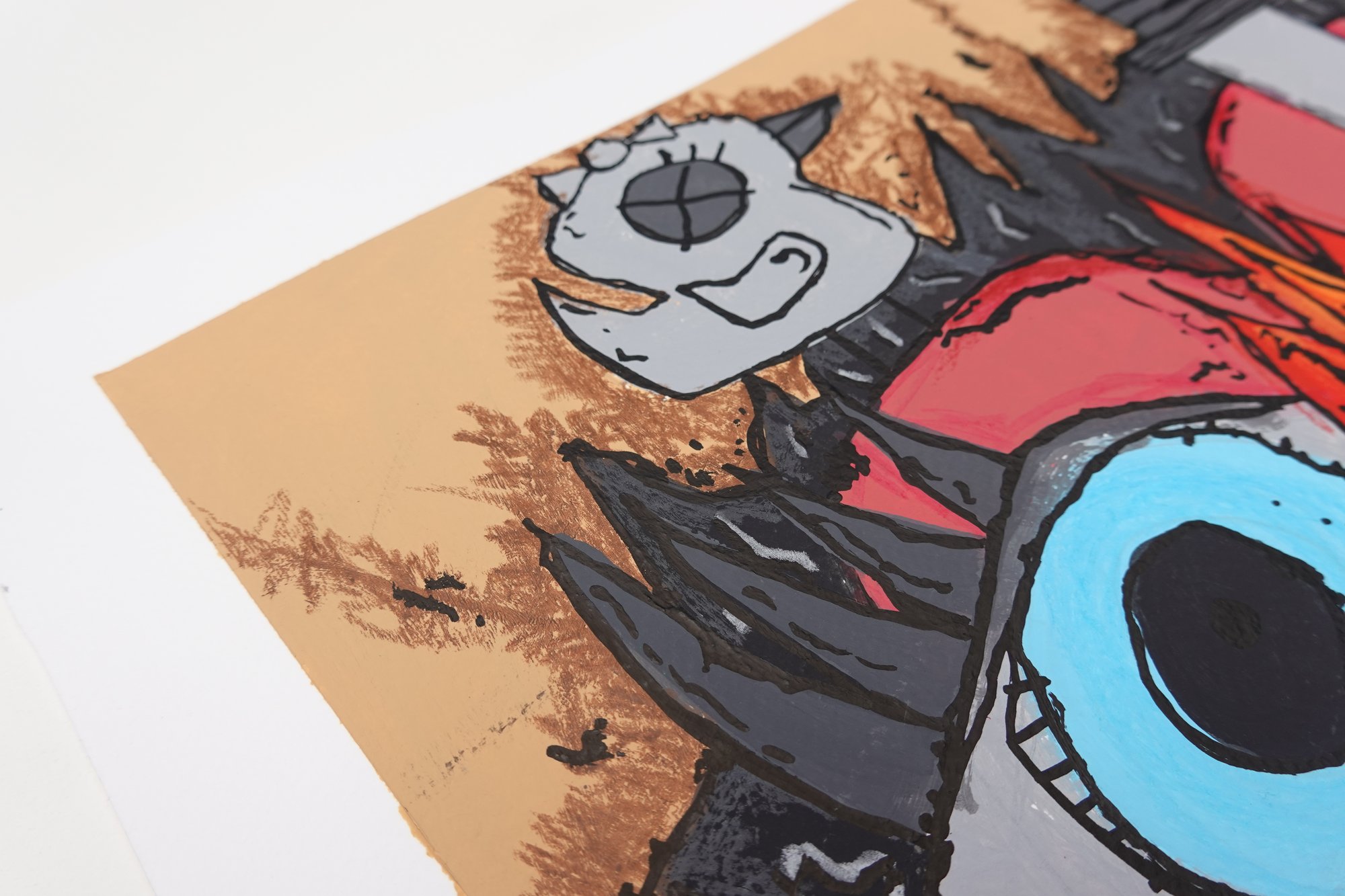 As Part of the Thumbnail Chronicles collection, this piece titled Corazon Rotundo is a one of a kind, original 1 of 1 artwork. The full piece, including its white border, measures 17 inches high by 17 inches wide. Created using acrylic paint, crayon, and colored pencil on fine art paper, the piece was completed in the year 2023.