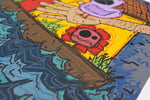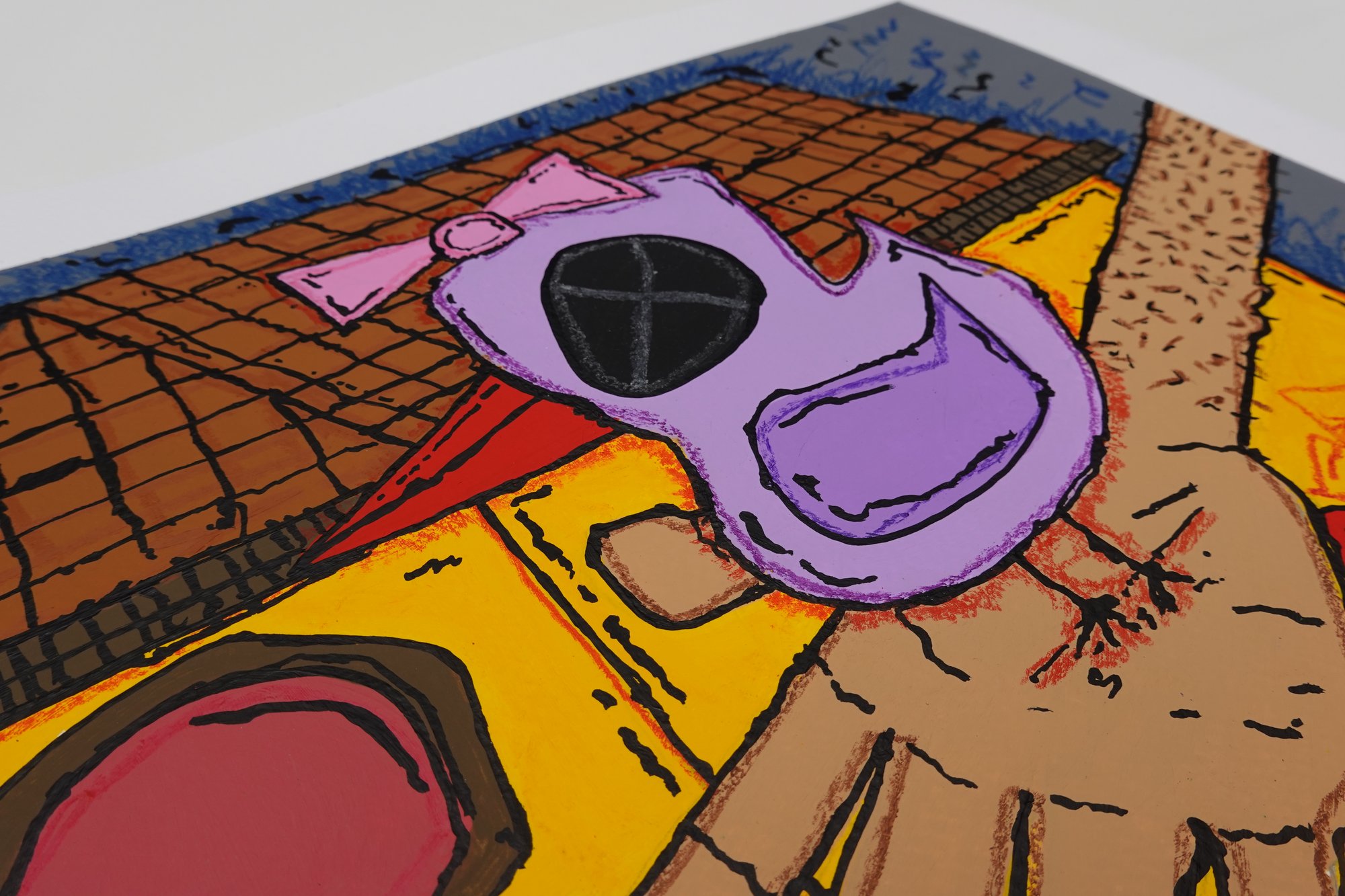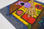 As Part of the Thumbnail Chronicles collection, this piece titled High Tide is a one of a kind, original 1 of 1 artwork. The full piece, including its white border, measures 17 inches high by 17 inches wide. Created using acrylic paint, crayon, and colored pencil on fine art paper, the piece was completed in the year 2023.